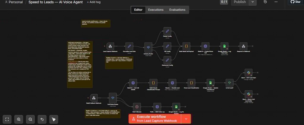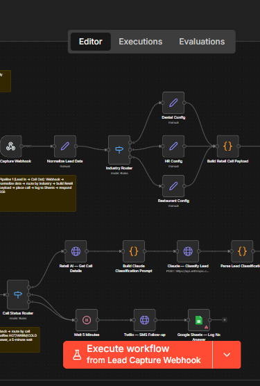 Pipeline 1 (Lead In → Call Out): Webhook → normalize data → route by industry → build Retell payload → place call → log to Sheets → respond 200