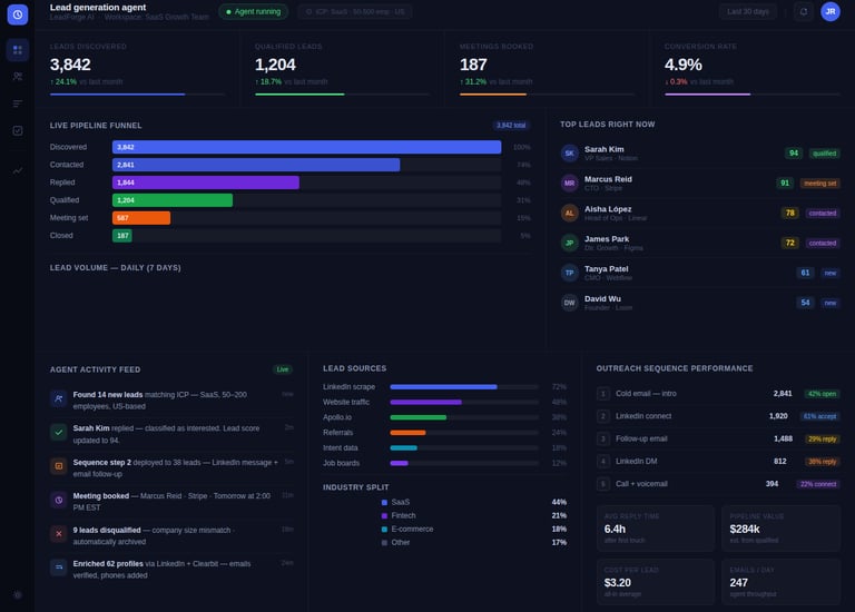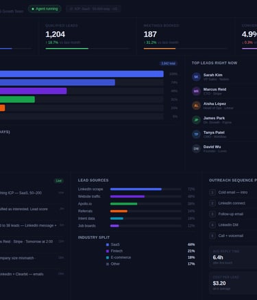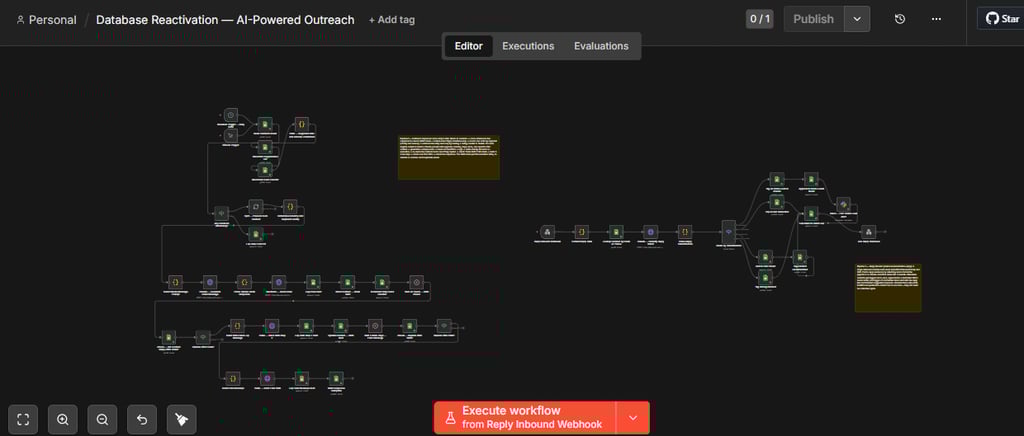 Pipeline 1 — Outreach Sequencer (runs daily 9 AM): Reads all contacts → cross-references two suppression checks (DNC sheet + contact-level flags) simultaneously → scores and sorts by segment priority and recency → enforces the daily send cap by reading a rolling counter in Sheets. For each eligible contact it builds a Claude prompt with segment, industry, days-since, and specific offer context → generates a unique email → sends via SendGrid → logs → waits exactly 48 hours in-execution → re-reads the contact row to see if they replied → sends Twilio SMS if still silent → waits 5 more days → sends one final SMS → closes the sequence. The Wait nodes persist execution state, so restarts or crashes don't duplicate sends.