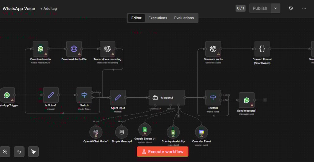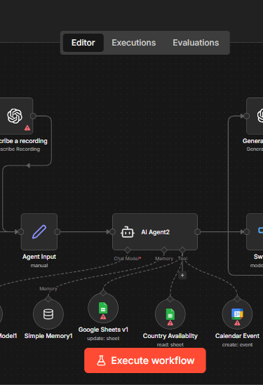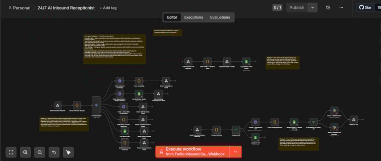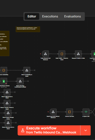 Pipeline 2 — Real-time Function Handler (/webhook/retell-function): The heart of the system. When the AI agent needs to do something mid-conversation — check availability, book, send an SMS, transfer, or detect spam — Retell posts here. A Switch node routes to 6 different handlers and returns structured JSON. Retell resumes the conversation with the result. This has to respond within ~2 seconds or Retell times out, so there's no heavy processing here.
